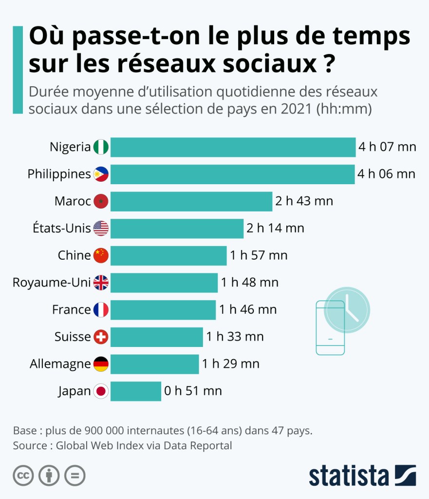 Dans le monde, il est estimé que les internautes passent en moyenne 2 heures et 27 minutes par jour sur les réseaux sociaux. Mais les durées d’utilisation sont très variables selon les pays, comme le rapporte Statista. En France, la durée moyenne d’utilisation quotidienne des réseaux est de 1h46. 👇🏻